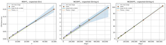 The results align with the intended complexity interpretations. Across a increase in n, MSPIT∞ grows by , MCSPIT∞ by , and MCDSPIT∞ by , indicative of near-linear behavior over our range. Least-squares fits achieve throughout; the log–log slope is for MSPIT∞ and ≈1.00 for MCSPIT∞ and MCDSPIT∞, with the latter showing a mild finite-size preference for in the parametric regressions (Table 3). Together, these diagnostics suggest versus behavior in practice for the studied algorithms.
