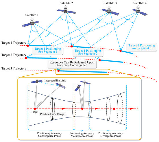 Figure 2 demonstrates the coupling relationship between the positioning precision convergence process of dual-satellite stereoscopic observation and the multi-target cyclic observation scheduling mechanism. The left side describes the precision evolution process of a single target under stereoscopic observation mode, while the right side shows the multi-target resource allocation strategy based on precision states. In the initial stage of stereoscopic observation, target position uncertainty manifests as a large-scale error ellipsoid. Through dual-satellite cooperative angle measurement, combined with the cumulative observation matrix from Equation (17) and the theoretical precision covariance from Equation (18), position error exhibits exponential convergence characteristics. When the condition number of cumulative observation matrix satisfies and the theoretical precision meets mission requirements, the system determines that the target has entered a stable tracking state.