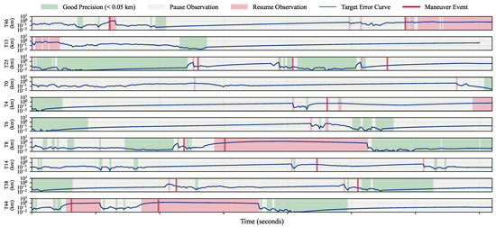 The maneuvering scenario evaluates the algorithms’ dynamic adaptation capabilities by introducing target orbital maneuvers. According to the experimental design, 15 targets (30%) randomly execute impulsive orbital maneuvers following a Poisson process (/step), with velocity increments km/s applied instantaneously to targets, with maneuver directions uniformly distributed in three-dimensional space. At least 300 s must pass after each maneuver before another maneuver can be executed.