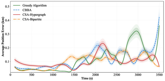 In terms of precision achievement time, the CSA-Hypergraph method requires only 234.5 s to reduce the initial error (10 km) to high-precision level (below 0.05 km), 44.9% faster than traditional methods. Due to high initial uncertainty, sufficient observations need to be accumulated to achieve the required precision. CBBA requires 356.2 s to complete the precision convergence process.