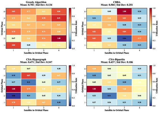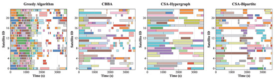 All algorithms achieve success rates exceeding 90%, with the CSA-Hypergraph method achieving the highest success rate of 98.8%, indicating its ability to reliably satisfy dual-satellite observation constraints (Equation (32)) and satellite resource constraints (Equation (33)) under normal conditions. The differences in success rates mainly stem from algorithms’ strategies in handling resource conflicts: the CSA-Hypergraph method avoids local resource competition through global optimization, while the greedy algorithm may result in some targets being unable to obtain sufficient observation resources due to its first-come-first-serve allocation strategy.