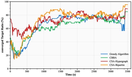 Figure 7 shows the convergence performance comparison of the four observation scheduling methods. Convergence rate is defined as the proportion of targets whose state estimation error remains below the 0.05 km threshold at the current time. Throughout the entire process, the CSA-Hypergraph and CSA-Bipartite Graph methods outperform the greedy algorithm and CBBA algorithm. The CSA-Hypergraph method (red line) exhibits the most stable convergence characteristics with minimal fluctuation amplitude, possibly because the hypergraph improves system stability through dynamic optimization of algebraic connectivity, enabling the system to maintain stable overall performance while rapidly responding to maneuvers. The CSA-Bipartite Graph method shows significantly slower convergence speed than other methods in the initial phase when s.