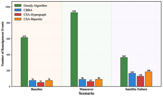 In the failure scenario, the greedy algorithm drops to 365 times, because reduced available satellites limit the reassignment selection space, and its simple proximity-based allocation strategy actually reduces adjustment needs when resources are limited. The CSA-Hypergraph method’s absolute quantity remains lower than CBBA and bipartite graph methods, further indicating that the CSA-Hypergraph method can make more precise decisions, reallocating resources only when necessary to maintain multi-target high-precision observation requirements.