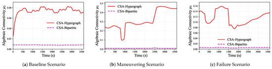 Figure 9 shows the temporal evolution characteristics of algebraic connectivity under three test scenarios, with corresponding statistical data shown in Table 6.