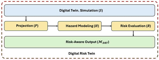 The DRT extends a digital twin by embedding risk-oriented operators into the simulation–decision pipeline. The simulation operator produces trajectories that describe system behavior under varying conditions. These outputs are passed through the projection operator , which extracts risk-relevant features, followed by the hazard operator , which transforms these features into stochastic failure rates and reliability functions. Finally, the risk operator aggregates hazards into quantitative risk measures, such as conditional value-at-risk or resilience indices. In this way, the DRT converts descriptive digital replicas into decision-support systems capable of guiding early warnings, resilience assessment, and optimized maintenance scheduling.