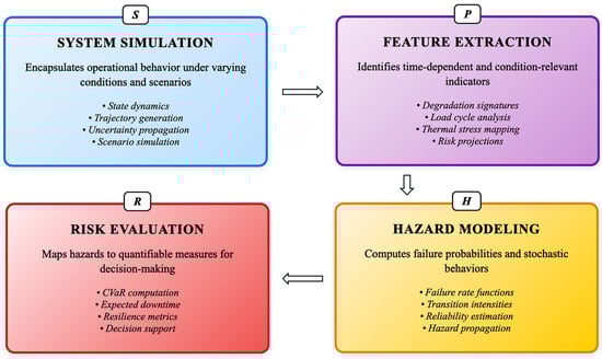 where is the simulation operator, mapping model to a probability measure over the space of finite-horizon trajectories ; is the projection operator that extracts risk-relevant features from simulated trajectories; is the hazard mapping that transforms features into failure intensities or degradation dynamics; and is a coherent risk functional that maps induced loss processes to scalar risk metrics.