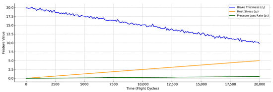 Risk features layer implements the projection operator that extracts risk-relevant indicators from system trajectories. In the aircraft brake system case study, these features include brake wear degradation, cumulative heat stress, and pressure loss rate. The projection operator transforms high-dimensional system states into interpretable degradation signatures that directly relate to failure mechanisms.