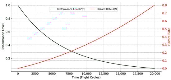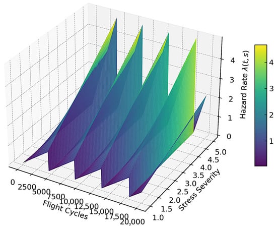 The 3D surface plot at Figure 12 presents the evolution of the hazard rate over time (flight cycles) and varying levels of stress severity. The sawtooth structure along the time axis reflects periodic proactive maintenance activities, which reset the hazard rate before it exceeds the risk threshold. As stress severity increases along the vertical axis, the peak values of also rise, emphasizing the role of operational conditions in driving failure risk. This figure visually supports the benefits of proactive maintenance in constraining hazard growth and preventing critical peaks.