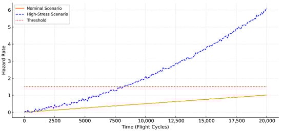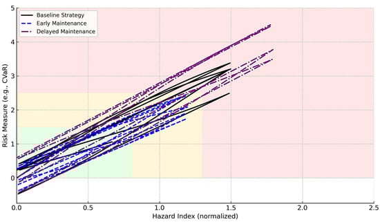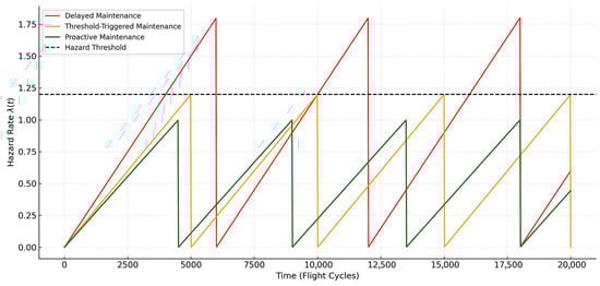Figure 11 illustrates the time evolution of the hazard rate across three maintenance strategies: delayed maintenance (red), threshold-triggered maintenance (orange), and proactive maintenance (green). The horizontal dashed line marks the hazard threshold, beyond which system risk becomes unacceptable.