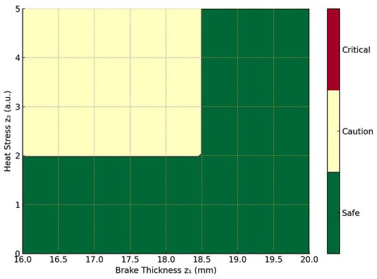Figure 14 visualizes a 2D decision map based on projected feature values (brake thickness and heat stress). It defines “Safe”, “Caution”, and “Critical” zones, enabling real-time classification of system health status and providing interpretable feedback to operators or predictive maintenance systems.