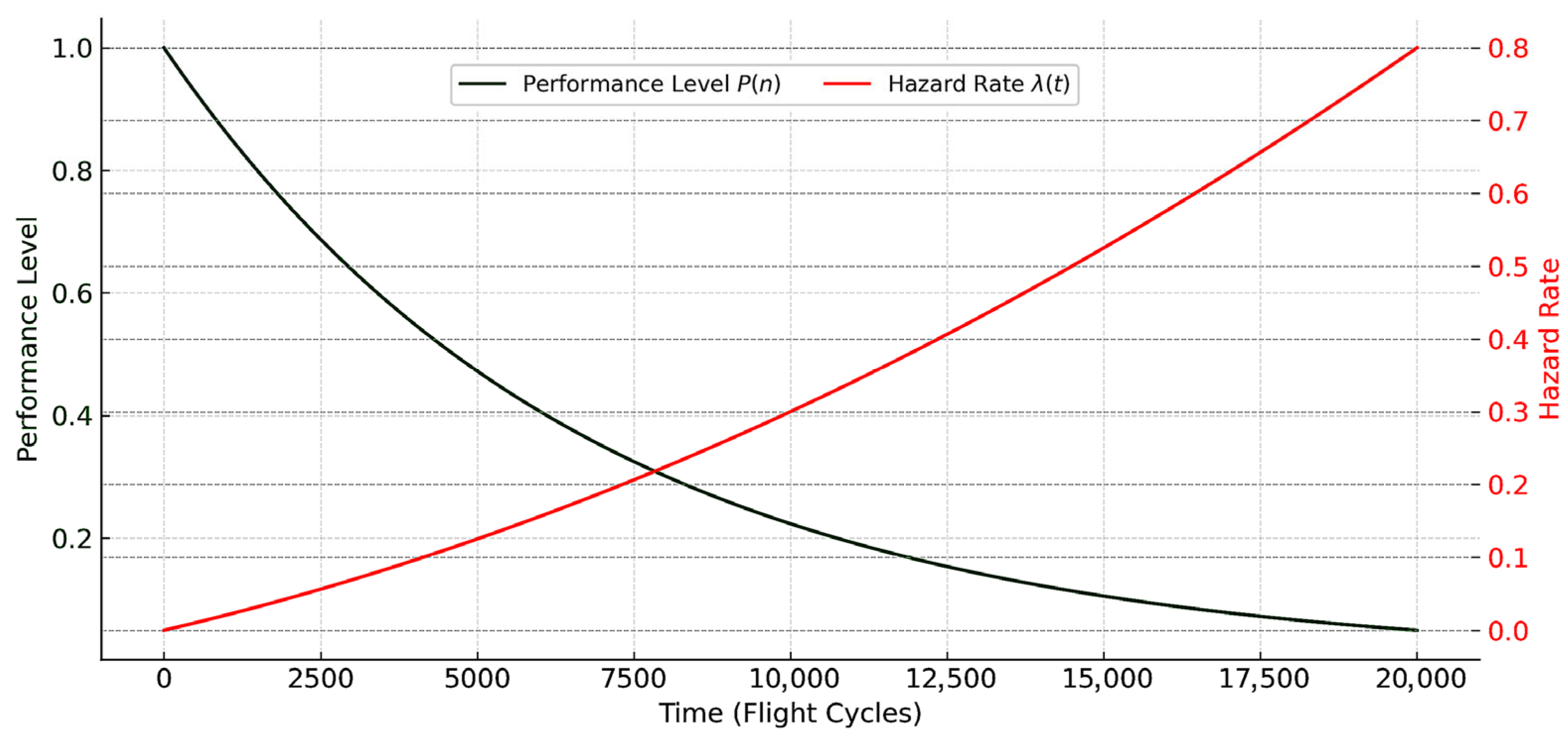 Figure 12 presents the evolution of the hazard rate over time (flight cycles) and varying levels of stress severity. The sawtooth structure along the time axis reflects periodic proactive maintenance activities, which reset the hazard rate before it exceeds the risk threshold. As stress severity increases along the vertical axis, the peak values of
