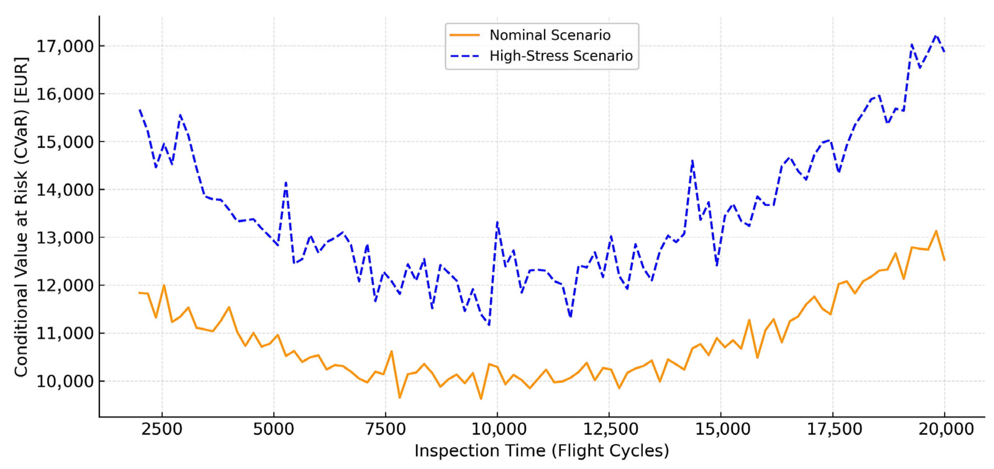 Figure 6 presents the CVaR curves for both scenarios. While both exhibit U-shaped cost profiles centered around an optimal inspection window (near cycle 65), the high-stress scenario incurs significantly greater CVaR values when inspections are delayed. This emphasizes the DRT’s utility in supporting time-critical maintenance decisions and avoiding worst-case financial outcomes under escalating degradation.