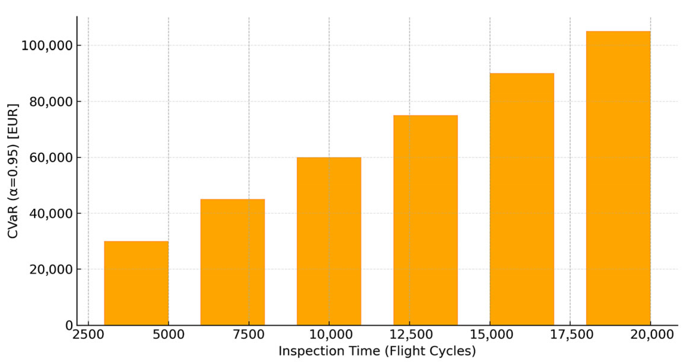 To assess how these hazard dynamics translate into risk-sensitive cost implications, CVaR was computed across a range of inspection timings.