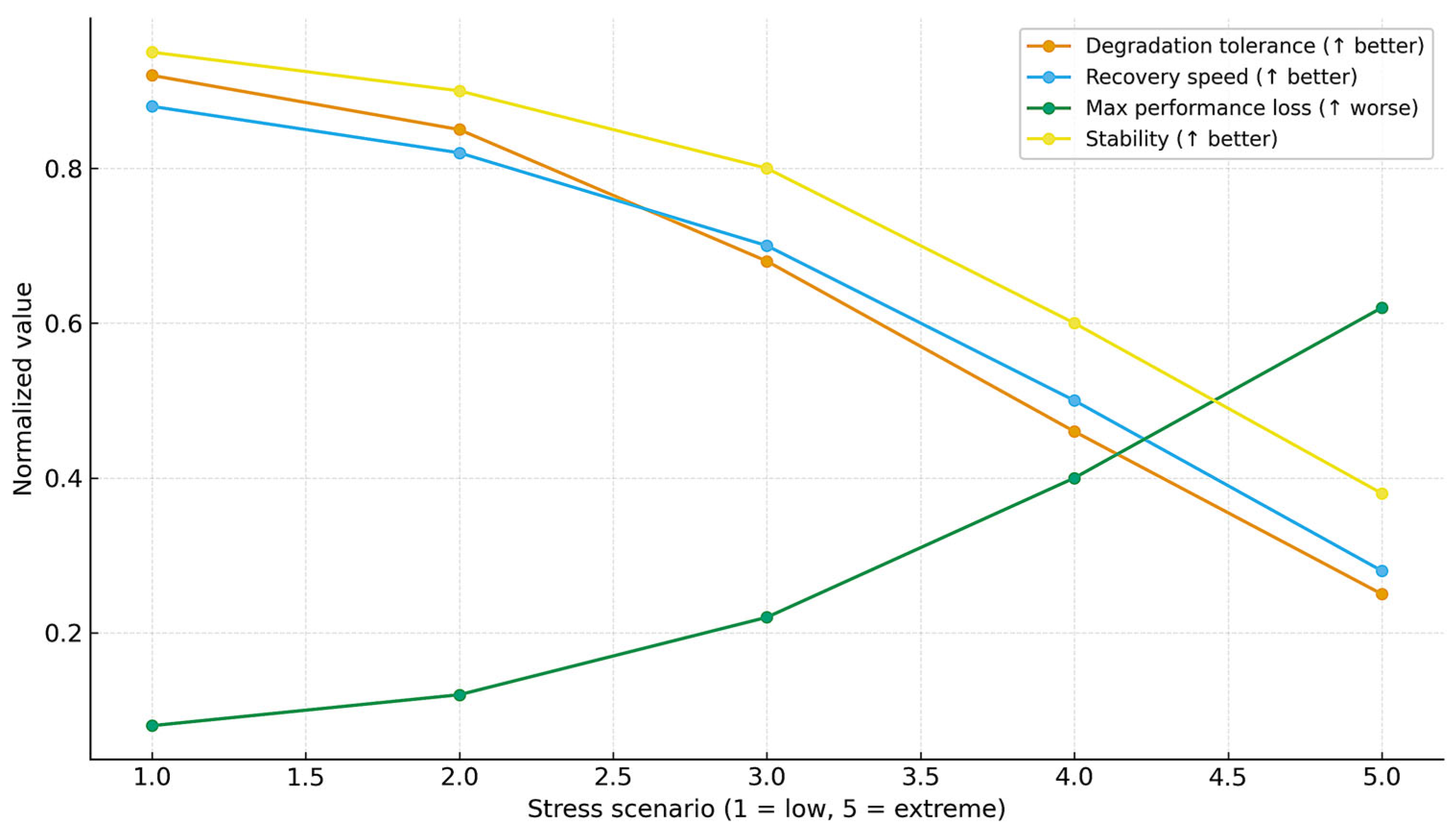 Figure 8 presents the resilience profiles as a function of stress level using a line chart, which makes nonlinear deterioration patterns explicit. Degradation tolerance and recovery speed decline steadily, stability remains robust until high stress levels, and maximum performance loss accelerates sharply under compounding hazards.