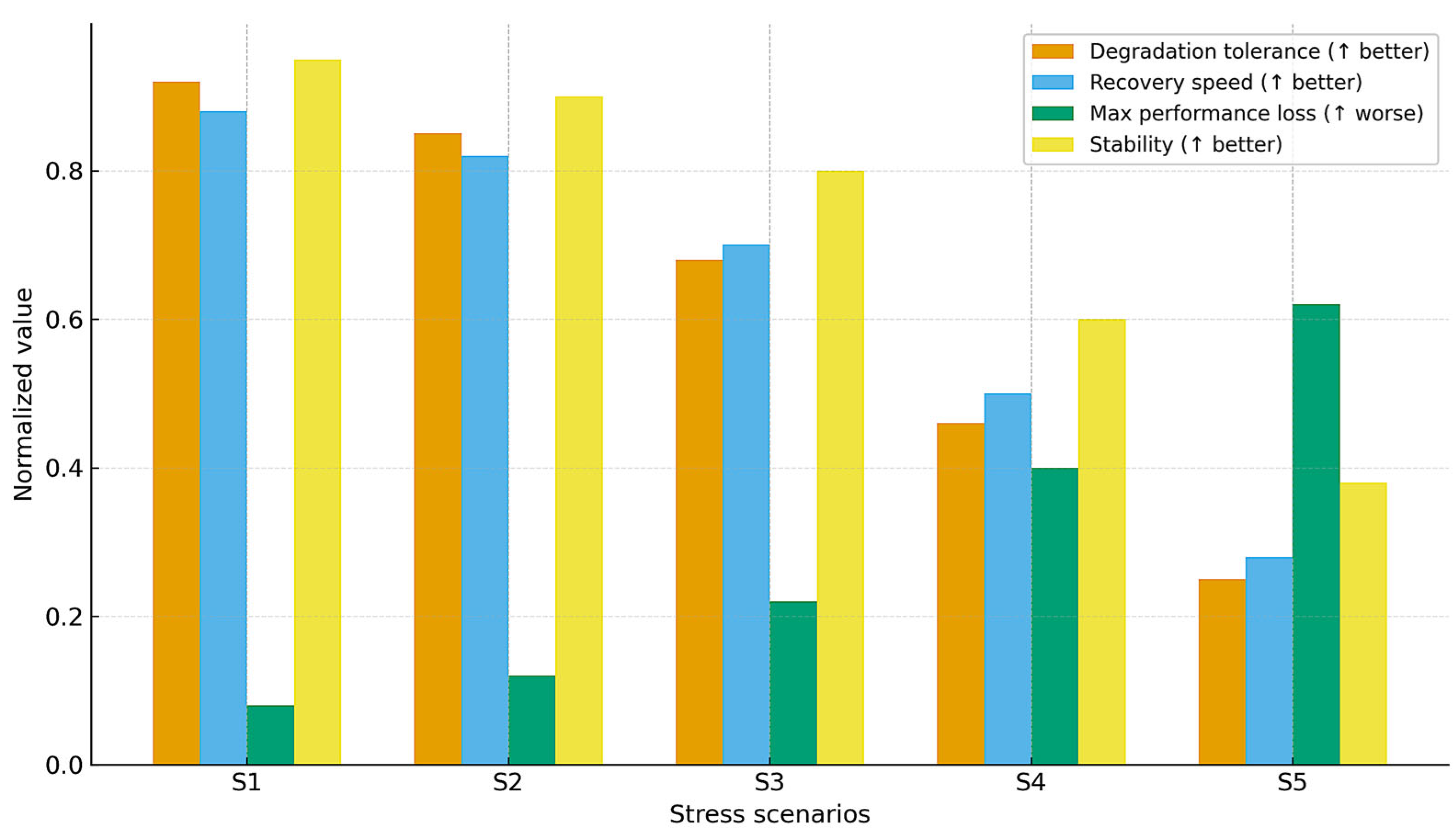 Figure 9 shows the same data in a grouped bar chart, emphasizing trade-offs across scenarios: at low stress (S1–S2) the four dimensions remain balanced, whereas at high stress (S4–S5) degradation tolerance and recovery speed decline disproportionately while maximum performance loss dominates the profile.