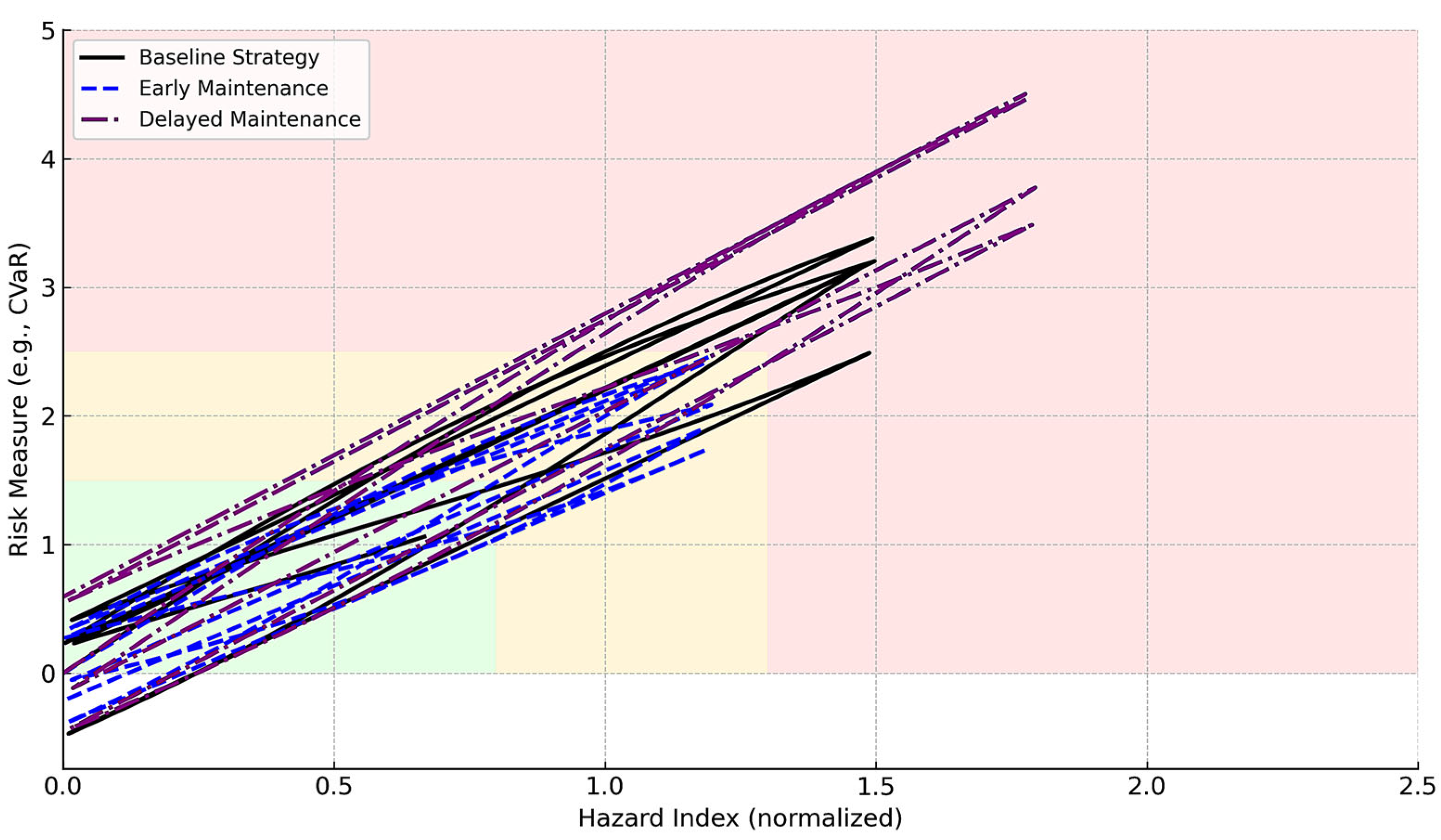 To demonstrate the decision-support role of the DRT, three representative maintenance strategies are considered. Delayed maintenance, also referred to as the baseline strategy (corrective, run-to-failure), performs interventions only after excessive delay or failure, which reduces short-term costs but increases risk exposure and unplanned downtime. Threshold-triggered maintenance, or the early maintenance strategy (preventive), initiates interventions once a predefined threshold such as wear, hazard value, or reliability limit is reached, thereby reducing the likelihood of failure but potentially leading to unnecessary actions if thresholds are conservative. Proactive maintenance, also called the risk-based strategy (predictive), adapts interventions dynamically using DRT-derived measures such as hazard trajectories, CVaR values, or resilience indices, balancing safety and cost through condition-aware decision-making. Together, these strategies illustrate how the DRT framework not only evaluates risks but also supports rational maintenance policies that optimize the trade-off between reliability, safety, and efficiency.