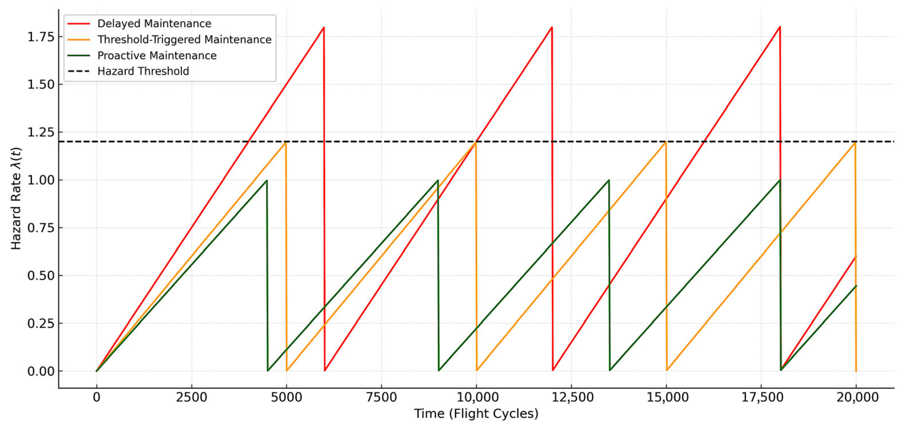 Each strategy demonstrates a characteristic sawtooth behavior where the hazard rate accumulates linearly due to wear and is periodically reduced by maintenance. Delayed maintenance allows the hazard to exceed the safe threshold before intervening. Threshold-triggered maintenance activates when the threshold is reached. Proactive maintenance performs actions before the threshold is breached, reducing risk exposure and enabling more stable reliability profiles. This comparison highlights the trade-off between risk containment and intervention frequency.