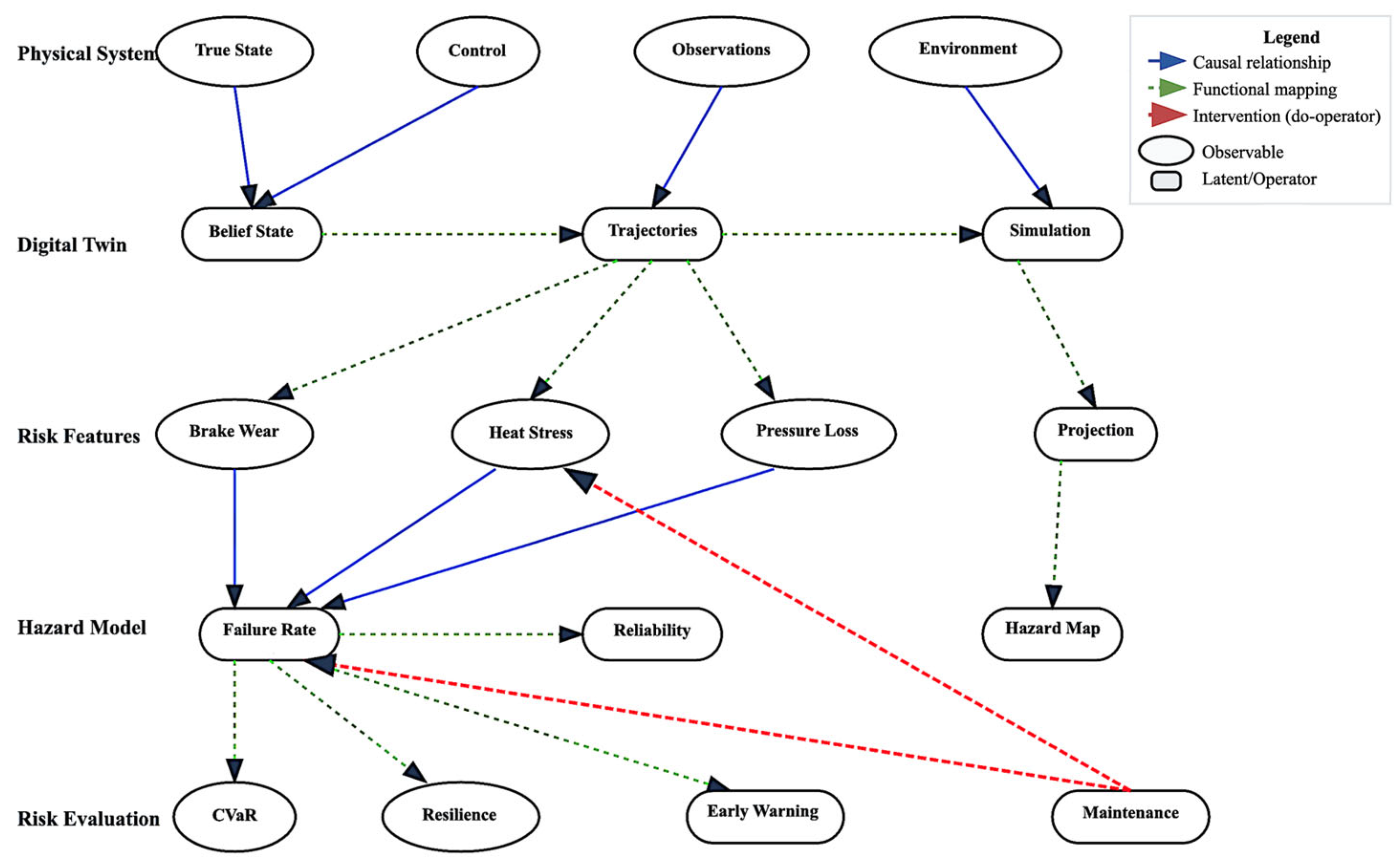 The risk evaluation layer aggregates hazard information into actionable risk metrics through the risk functional. CVaR quantifies worst-case financial exposure, resilience metrics assess system robustness, and early warning alerts provide operational triggers. The maintenance decision node represents interventions using Pearl’s do-operator, enabling counterfactual reasoning about preventive actions.