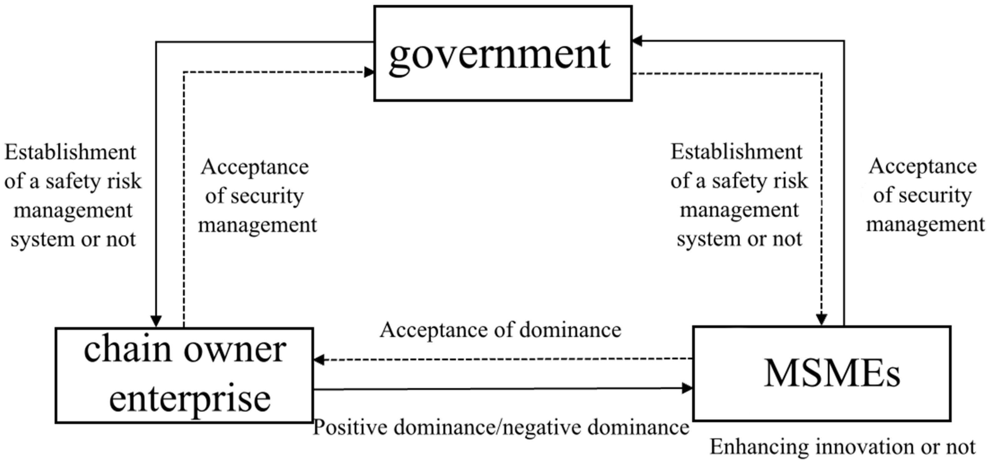 Figure 2. It can be observed that the governance strategies of chain-chain owner enterprises y and upstream and downstream small and medium-sized enterprises in the supply chain z influence the government’s choice of governance strategy. Meanwhile, the government’s safety management benefits, safety management costs, and rewards and penalties for chain-chain owner enterprises and small and medium-sized enterprises in the supply chain also affect the government’s governance strategy.