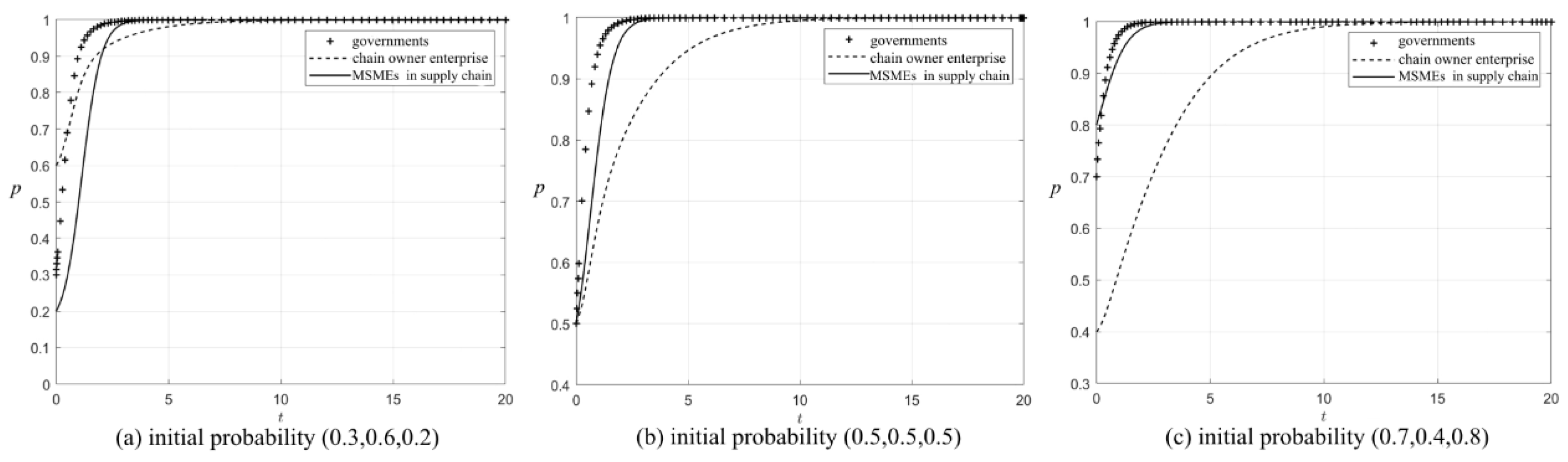 To examine the impact of different initial probability strategy choices by government departments, chain owner enterprises, and small and medium-sized enterprises (SMEs) in the upstream and downstream of the supply chain on the stability of the evolutionary game system, the initial conditions at time t = 0 are set as follows: the government adopts the “establishing a safety risk management system” governance strategy, chain owner enterprises choose the “active leadership” governance strategy, and SMEs in the upstream and downstream of the supply chain opt for the “strengthening digital technology innovation” governance strategy with the probabilities (0.3,0.6,0.2), (0.5,0.5,0.5) and (0.7,0.4,0.8), respectively. The simulation results are shown in