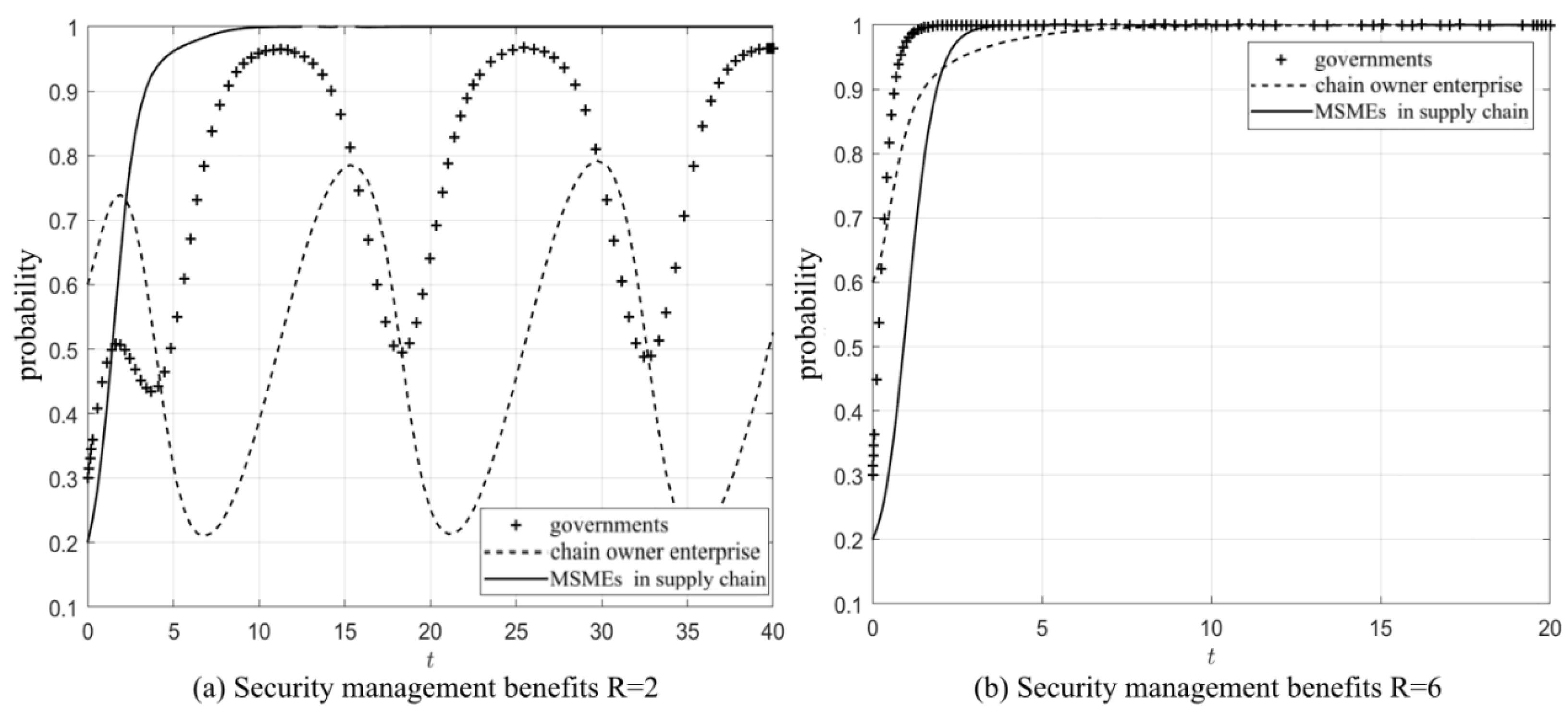 In this section, the government’s safety management benefits R are set to 2 and 6, with the simulation results shown in