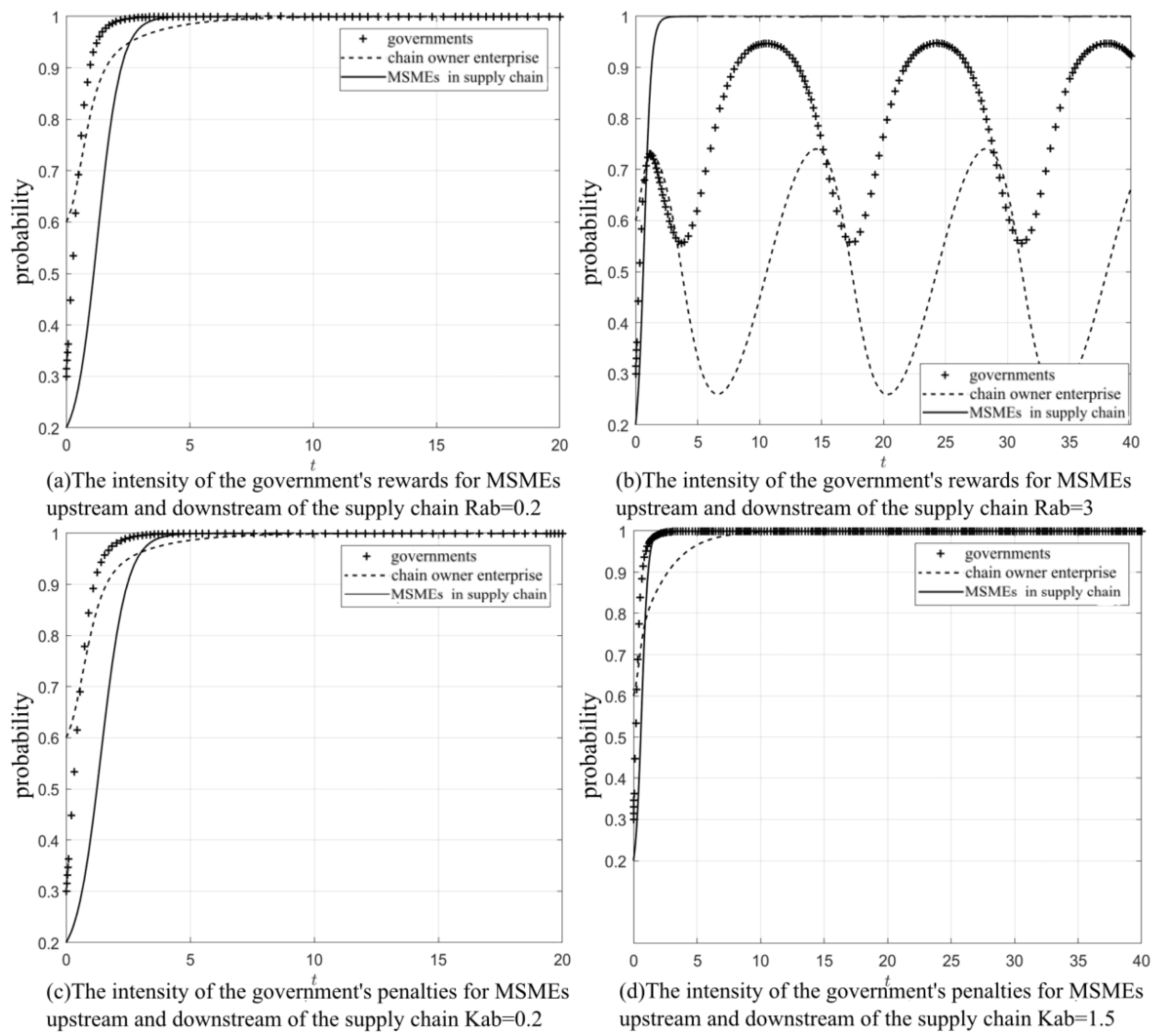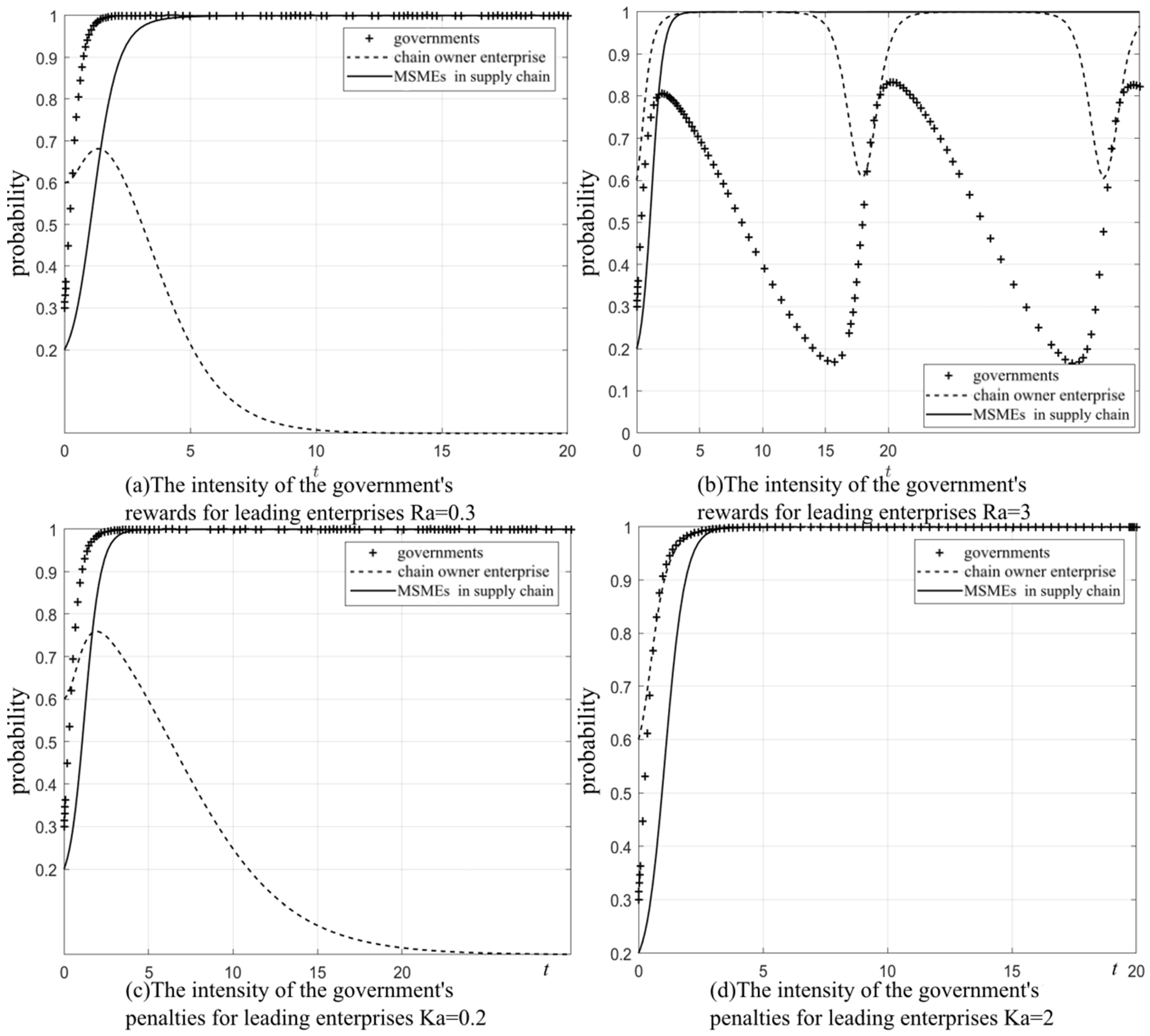 Figure 10c,d, it can be observed that the punishment intensity of the chain owner enterprises for SMEs does not affect the governance strategies of the government, chain owner enterprises, and SMEs in the upstream and downstream of the supply chain. Increasing the punishment intensity accelerates the time for the chain owner enterprises and SMEs in the upstream and downstream of the supply chain to reach a stable state, but the effect is relatively small. In the face of prominent supply chain security issues, when guiding the innovation development of SMEs in the supply chain, chain owner enterprises should primarily rely on reward measures rather than imposing excessive punishment. Excessive punishment not only weakens the enthusiasm of SMEs to strengthen digital technology innovation but also results in less effective governance outcomes.