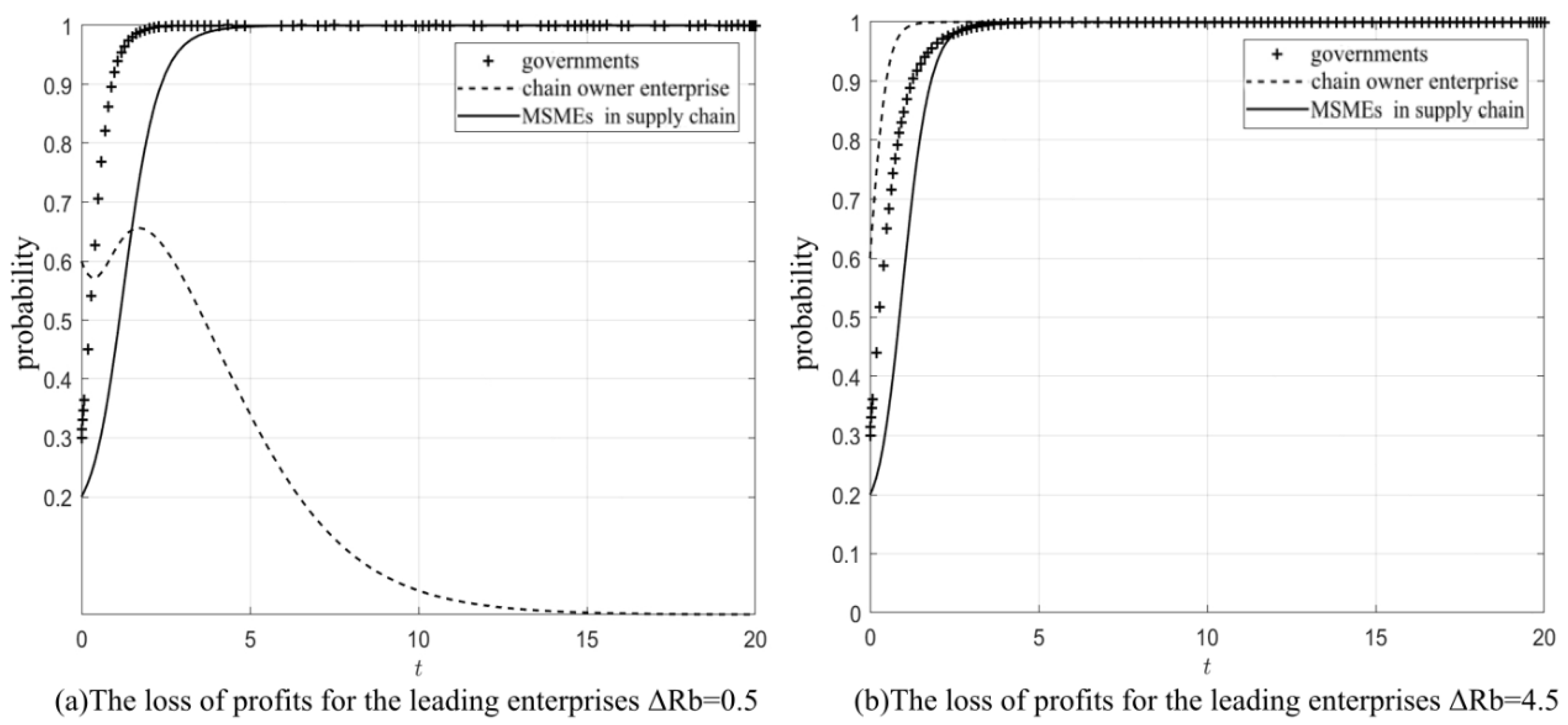 Figure 9, the loss of benefits influences the governance strategies of chain owner enterprises, as well as the evolutionary speed of the government and SMEs in the upstream and downstream of the supply chain. When