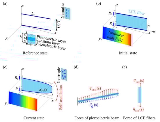 The physical model of the LCE fiber–piezoelectric beam system is illustrated in Figure 1. The system consists of two piezoelectric bimorph cantilevered beams, densely arranged vertically distributed optical response LCE fibers, and gradient light. Figure 1a shows the initial length of LCE fibers as , in the LCE fiber, the molecular rods inside the fiber are preferentially arranged along its axis, referred to as nematic. With the effect of gravity on the piezoelectric beam neglected, and the beam remains unbent. Where the piezoelectric bimorph cantilevered beam consists of a substrate and two upper and lower piezoelectric layers. The piezoelectric layers are assumed to be tightly bonded to the substrate, with both the top and bottom surfaces covered by electrodes. The electrodes thickness between the substrate and piezoelectric layers, as well as the electrode thickness on the top and bottom surfaces of the piezoelectric layers, can be neglected. Both layers exhibit the same linear elastic behavior. In the present study, the material properties are assumed to be uniform, and perfect bonding is assumed at all interfaces. These simplify the model and highlight the main mechanism under investigation. The beam has a length of , a width of , and a thickness of . The unit mass of the piezoelectric layer is . Figure 1b represents the initial state. The system is connected in series to an external resistor . The LCE fibers is closely distributed along the piezoelectric beam, varying linearly with position, with the fiber’s mass neglected. In Figure 1b, a coordinate system is established, with the -axis along the beam’s direction and the -axis perpendicular to the beam’s end, where the beam’s end is the origin. The angle between the lower piezoelectric beam and the horizontal axis is , and the two beams are symmetrically arranged. The angle between the lower piezoelectric beam and the horizontal axis is , and the two beams are symmetrically arranged. In this configuration, a non-linear light field with 808 nm wavelength source [60] is applied as the driving illumination, which is commonly employed in LCE actuation studies due to its efficient absorption and photothermal conversion. Figure 1c depicts the possible self-harvesting behavior of the system throughout its motion. The LCE fiber can capture light energy along its axis, and the rod-like molecules inside the fiber shift from the nematic state to the isotropic state, resulting in contraction of the fiber under the light field. When the beam bends, the LCE fiber moves into the low-light region. At low light intensity, a transition between the isotropic and nematic phases takes place, allowing the fiber to fully recover its initial length and relocate to the high-light region. Figure 1d shows the LCE fibers driving force and the damping force acting on the piezoelectric beam. Figure 1e shows the LCE fibers tension , which provides the driving force for the system. During each self-oscillating cycle, the LCE fibers contracts and recovers, pulling the piezoelectric beam to deform and output electrical energy.