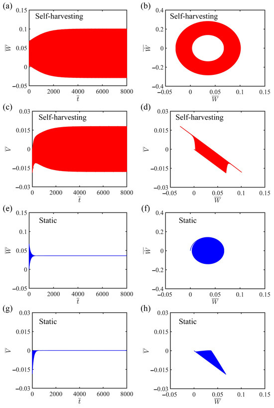 Figure 2 describes the time history of displacement, phase trajectories, voltage, and displacement–voltage response diagram of the LCE fiber–piezoelectric beam system with different first-order damping coefficient to demonstrate system’s two motion states. The time–history curve for the displacement in Figure 2a shows the self-harvesting state at , where the system’s amplitude stabilizes after converging to a stable value, indicating that the piezoelectric layers oscillate periodically with time. Figure 2b depicts a stable cycle associated with the self-harvesting state shown in Figure 2a. Figure 2c shows that the voltage reaches a stable state, and Figure 2d illustrates the relationship between the voltage and the deformation of the piezoelectric beam at a stable state. In contrast, Figure 2e displays the displacement time–history curve for . As shown in Figure 2f, the phase trajectory gradually converges to a point, indicating that the system has reached a static state. As shown in Figure 2g, the voltage decreases to zero over time, and in Figure 2h, the voltage at the equilibrium position is zero.