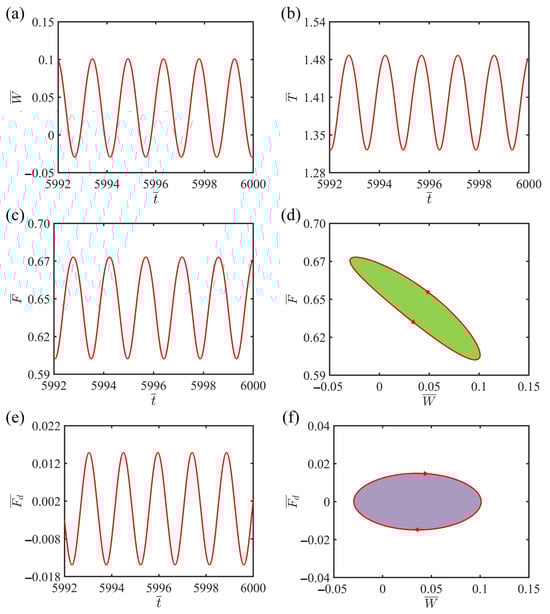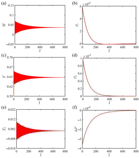 Figure 4 illustrates that when the first-order damping coefficient , the LCE fiber–piezoelectric beam system fails to acquire sufficient kinetic energy and eventually reaches a static state. The system parameters are set as , , , , , , , , . Figure 4a shows the time–history curve of the displacement at the end of the LCE fiber, which corresponds to the static state depicted in Figure 2e. Figure 4c and Figure 4e present the time–history curves of the LCE fiber tension and the damping force, respectively. Consistent with the displacement, both quantities decrease to zero as the system reaches the static state. In Figure 4b, the power of the LCE fiber tension and in Figure 4d, the power of the damping force exhibit the same downward trend. Prior to reaching the static state, consistently remains greater than . Figure 4f shows the time–history curve of the difference between and , denoted as , confirming that the difference remains negative until the system reaches the static state, where it becomes zero. Therefore, the damping coefficient must be chosen within a reasonable range to ensure that the energy absorbed from illumination can effectively counteract energy dissipation, thereby sustaining stable self-oscillation of the system.
