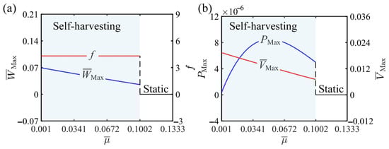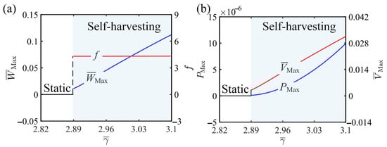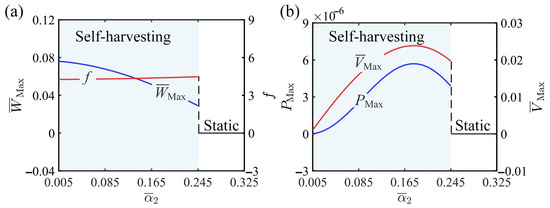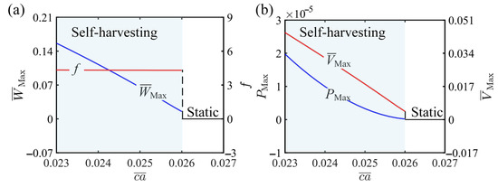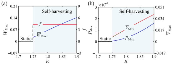 Figure 11 shows the effect of the electromechanical coupling coefficient on the LCE fiber–piezoelectric beam system, while the remaining parameters are fixed at , , , , , , , , . is the bifurcation point between the self-harvesting state and the static state of the LCE fiber–piezoelectric beam system. As shown in Figure 11a, the amplitude decreases with the increase in the electromechanical coupling coefficient, while the vibration frequency shows a slight rise, as indicated by the blue solid line. Figure 11b shows that as the electromechanical coupling coefficient increases, the voltage first increases and then decreases. Since power is proportional to the square of the voltage, the power output exhibits the same trend as the voltage. In Figure 11, when , the system operates in the self-harvesting state, whereas when , the system transitions to a static state. In conclusion, ensuring that the system operates near the optimal electromechanical coupling coefficient is crucial for maximizing energy output.