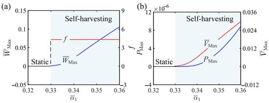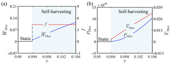 Figure 7 reveals the effect of the light gradient on the LCE fiber–piezoelectric beam system, with other parameters set as , , , , , , , , . is the bifurcation point between the two states of the LCE fiber–piezoelectric beam system. In Figure 7a, when , the LCE fiber–piezoelectric beam system enters the self-harvesting state. As the light intensity gradient increases, the amplitude grows while the vibration frequency remains relatively stable. This behavior is attributed to the greater light absorption by the LCE fiber, which results in a larger internal temperature difference, increased thermal stress, and uneven deformation, thereby enhancing the vibrational response. In Figure 7b, the increase in amplitude leads to a higher piezoelectric voltage, resulting in a significant improvement in power generation. When , the LCE fiber–piezoelectric beam system transitions to a static state. These results demonstrate that precise control of the light intensity gradient is crucial for enhancing energy harvesting performance and optimizing system design.