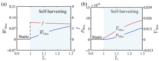 Figure 10 illustrate the effect of the LCE initial length on the LCE fiber–piezoelectric beam system, while the remaining parameters are fixed at , , , , , , , , . As the initial length of the LCE increases, both the amplitude and voltage show significant improvements. Figure 10a shows that during self-oscillation, the amplitude increases with the initial length of the LCE, while the self-oscillating frequency slightly decreases. Figure 10b demonstrates that the beam deformation grows with the increase in initial length, leading to a higher voltage output, and the power also rises accordingly, consistent with the trend described in Equation (45). Therefore, the net work performed in one cycle increases with the initial length of the LCE. When , the LCE–piezoelectric beam system is in the self-harvesting state; when , the system reaches a static state. To enhance light energy absorption, extending the initial length of the LCE fiber can improve the efficiency of converting light energy into electrical energy.