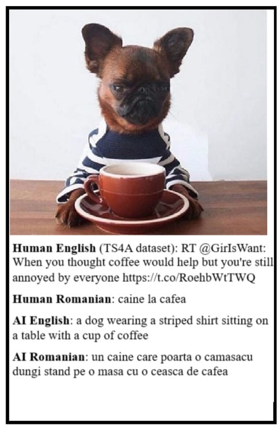 For each language, English and Romanian, the dataset contains an equal number of human-written and AI-generated captions. Human-authored descriptions were collected through manual annotation, while the AI-generated counterparts were produced using a state-of-the-art vision-language model. The AI-generated descriptions were obtained using the BLIP-2 model (Bootstrapped Language-Image Pretraining 2) [1], and then translated into Romanian using MarianMT [2]. This balanced composition allows for controlled comparative analyses of linguistic patterns, stylistic differences, and the detectability of machine-generated content across both languages. The dataset, together with source code for reproducing our experiments, is publicly available on GitHub (https://github.com/Dani25/Human-vs-AI (accessed on 1 September 2025)). The dataset includes references to the original images from the public T4SA corpus [3] but not the images themselves. Instead, we provide the corresponding image file names, together with the human- and AI-generated descriptions.