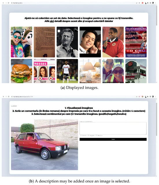 To collect human-generated image descriptions, we created a web application (see Figure 2). We invited students from the Faculty of Informatics and Engineering at the University of Alba Iulia to select as many images as they wished and leave a comment describing their impression of each image. Logging in was not required for submitting comments, as anonymous access was deemed sufficient. Furthermore, users were clearly informed about the purpose and implications of the website, including data collection, ensuring that no personal information was recorded.