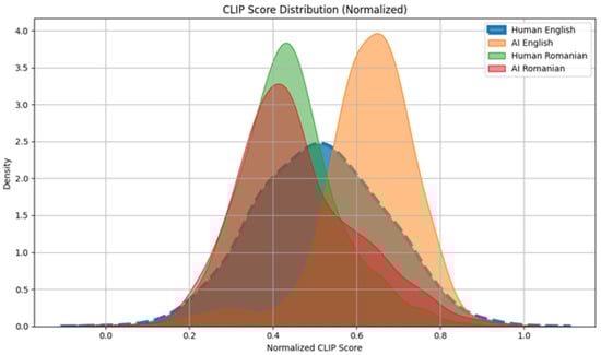 In our experiments, CLIP similarity is especially helpful since it offers a numerical indicator of the semantic alignment between images and their associated captions in a shared multimodal embedding space. In contrast to metrics that only depend on text, CLIP assesses whether the visual content and the textual description truly match. This enables us to evaluate how accurately human- and artificial intelligence-generated captions convey an image’s intended meaning, going beyond superficial linguistic features. Comparing similarity distributions between languages and sources (human vs. AI) allows us to spot systematic alignment or misalignment patterns, providing an alternative viewpoint to classification models and purely linguistic analyses.