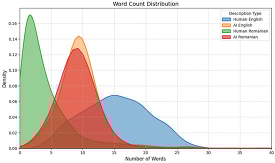 KDE distribution of word counts in Romanian and English texts (human vs. AI-generated). Human-written English texts are significantly longer than Romanian counterparts, while AI-generated captions show more consistency.