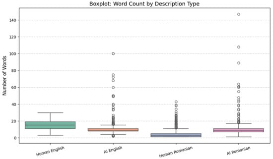 Boxplot comparison of word lengths across Romanian and English descriptions (human- vs. AI-generated). The boxplot clearly separates human vs. AI texts, with humans showing wider variance.