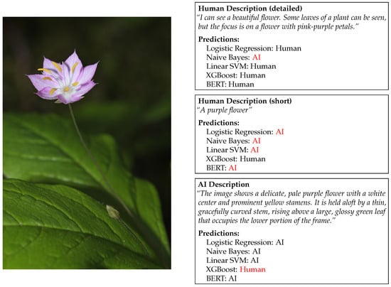 Figure 6 is an example which demonstrates how the length and richness of a human-written English description can significantly influence classification outcomes. When the description is detailed and includes descriptive elements (“I can see a beautiful flower…pink-purple petals”), most models correctly identify it as human-generated, with only Naive Bayes misclassifying it. However, when the same visual content is reduced to a short, minimalistic phrase (“A purple flower”), the classification accuracy drops sharply: Logistic Regression, Naive Bayes, Linear SVM, and even BERT label it as AI-generated, leaving only XGBoost with the correct classification. This pattern suggests that several models rely heavily on lexical diversity, complexity, or the presence of stylistic cues—features that are largely absent in very short, factual statements. Interestingly, most models, except XGBoost, still correctly identify the AI-generated description, which is more elaborate and contains nuanced visual details. This indicates that while high fluency in AI-generated text can mimic human style, subtle statistical and structural cues remain detectable for most classifiers. Overall, the example highlights a vulnerability of current detection systems: short, content-sparse human-written descriptions are particularly prone to misclassification, especially by models sensitive to surface-level linguistic features.