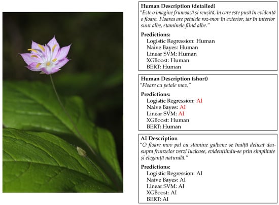 Figure 7 illustrates how model predictions vary depending on the nature and length of the input descriptions in Romanian. When the human-written description is detailed and includes expressive or descriptive language, all models correctly identify it as human-generated. However, when the same content is reduced to a short and factual phrase (“Floare cu petale mov.” (en. “Flower with purple petals”)), several models—including Logistic Regression, Naive Bayes, and Linear SVM—misclassify it as AI-generated. This suggests that such classifiers rely, at least in part, on lexical richness, complexity, or stylistic cues to distinguish between human- and machine-generated texts. Interestingly, both XGBoost and BERT correctly label the shorter version, possibly due to their higher capacity to capture contextual subtleties or structural patterns beyond surface-level features. In contrast, the AI-generated description—although more fluent and expressive than expected—is consistently recognized as AI by all models, indicating that, despite the high quality of generation, certain detectable patterns still differentiate it from human writing. Overall, this example highlights a limitation in current classifiers: human-written descriptions that are brief or neutral in tone may be prone to misclassification, especially by models more sensitive to surface linguistic cues.