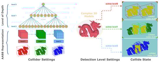 Figure 1 illustrates our octree-based collision-detection framework. AABBs are used at different levels to coarsely identify regions of interest, and the number of colliding candidates significantly decreases with deeper levels due to improved spatial filtering.