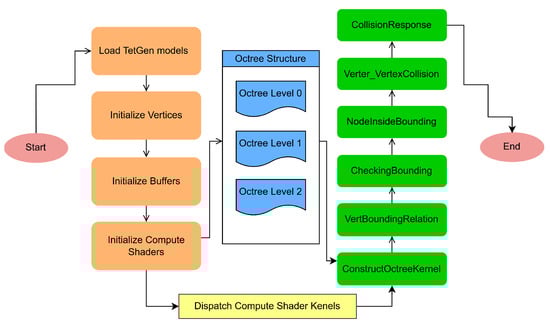 Collision detection is a fundamental component of rigid-body simulation, responsible for identifying potential contacts between moving objects. Due to its quadratic complexity in naïve pairwise comparisons, most modern approaches adopt a two-stage pipeline consisting of a broad phase and a narrow phase [19]. In the broad phase, computationally inexpensive bounding volumes are used to eliminate non-intersecting object pairs, while the narrow phase performs fine-grained geometric checks to confirm actual collisions. One of the most widely used bounding volumes is the Axis-Aligned Bounding Box (AABB), which encloses each object in a rectangular box aligned to the coordinate axes. Overlap tests between AABBs can be performed using simple min–max comparisons on each axis, making them particularly suitable for GPU-parallel execution [20]. Several hybrid approaches extend this idea by integrating Oriented Bounding Boxes (OBB) or sphere trees to better conform to object geometry and reduce false positives [21]. To further improve scalability in complex scenes, spatial partitioning techniques such as the Octree have been extensively employed [22]. An octree recursively subdivides the 3D simulation space into eight octants, forming a hierarchical structure in which objects are inserted based on their spatial location. When combined with AABBs at each level, the Octree–AABB hierarchy allows efficient pruning of distant or non-overlapping objects, significantly reducing the number of narrow-phase tests required. This hierarchical scheme is especially effective in simulations with non-uniform object distributions or sparse interactions. Recent studies have explored GPU acceleration of octree traversal and bounding volume queries by leveraging data-parallel operations. Techniques such as non-recursive tree search [23] or GPU-accelerated bounding volume hierarchies [24] allow real-time traversal and intersection tests across thousands of objects. Extensions such as probabilistic volumetric mapping (PVM) further improve memory utilization while maintaining interactive frame rates in dynamic environments [25]. In our framework, we adopt a hierarchical Octree–AABB structure to efficiently manage broad-phase collision detection. Objects are inserted into spatial cells based on their AABB extent, and overlap queries are performed hierarchically to eliminate redundant checks. This structure aligns well with GPU compute pipelines, enabling coarse-to-fine pruning and scalable parallelism even in densely populated scenes.