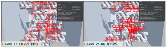 Figure A1 provides a qualitative visualization of the hierarchical collision-detection framework applied under varying Octree depth configurations. The figure consists of three rows, each corresponding to a specific depth level of the Octree (Level 0, Level 1, and Level 2 from top to bottom), and three columns representing different 3D mesh models—Bunny, Armadillo, and Dragon, arranged from left to right. Red wireframe boxes denote the Axis-Aligned Bounding Boxes (AABBs) used to encapsulate geometry for broad-phase collision detection. At Level 0, the bounding regions are coarse and large, resulting in fewer initial collision checks but a higher chance of false positives due to low spatial selectivity. As the depth increases, particularly at Level 2, the simulation space is subdivided into finer partitions, enabling more precise localization of collision candidates and effectively reducing the number of unnecessary checks. However, this comes at the cost of increased computational overhead for tree traversal and bounding volume management. The visual comparison clearly demonstrates the spatial filtering effect introduced by deeper Octree hierarchies. In densely populated regions such as those represented by the Dragon model, the Level 2 configuration produces significantly tighter bounding volumes, thereby enhancing the effectiveness of spatial pruning. This observation aligns with the quantitative results discussed in Section 4, further validating the trade-off between spatial resolution and performance in hierarchical collision-detection schemes.