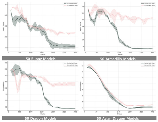 To quantify the observed trends, we divided the simulation into an early phase (≤1500 frames) and a late phase (1500–3000 frames) and computed the mean FPS for each method. During the early phase, Octree–AABB achieved FPS vs. FPS for Bunny (+10.08%), vs. for Armadillo (+17.75%), vs. for Dragon (–4.31%), and vs. for Asian Dragon (+4.88%). In the late phase, the advantages of hierarchical culling became more pronounced: FPS vs. (+45.14%) for Bunny, vs. (+83.26%) for Armadillo, vs. (+75.85%) for Dragon, and vs. (+10.81%) for Asian Dragon. These results, summarized in Table A1 in Appendix A, confirm that hierarchical Octree–AABB sustains significantly higher throughput in dense state, while the performance of Spatial Hashing tends to fluctuate for models with extended appendages (e.g., Armadillo, Dragon) that map to multiple cells, increasing candidate checks and degrading efficiency in the late phase.