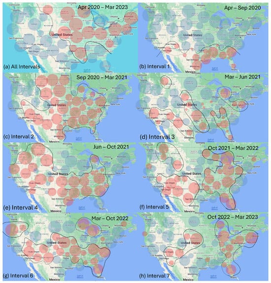 where is the maximum likelihood for the cylinder based on the observed cases and the expected cases within the window. Here, is the likelihood under the null hypothesis, N is the total cases observed in the U.S. for each time interval, and represents the total expected cases. A likelihood ratio greater than one indicated that the number of cases observed exceeded expectations. The cluster with the highest likelihood was labeled the primary cluster, while other clusters were reported if they achieved significance at . The p-values for space–time clusters were determined through Monte Carlo simulations, using randomized iterations of the data to assess statistical significance [].