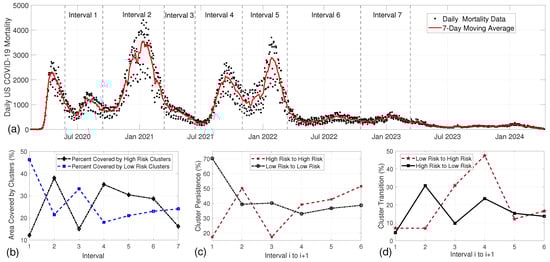 Time series of mortality data and spatial clusters. (a) Time series of U.S. COVID-19 mortality data across seven defined time intervals: (1) 24 May 2020–13 September 2020; (2) 13 September 2020–14 March 2021; (3) 14 March 2021–13 June 2021; (4) 13 June 2021–31 October 2021; (5) 31 October 2021–13 March 2022; (6) 13 March 2022–16 October 2022; and (7) 16 October 2022–12 March 2023. The figure illustrates the trends in mortality over these periods, highlighting significant fluctuations in COVID-19-related deaths. (b) The percentage of the area of the U.S. covered by significant high-risk (i.e., relative risk greater than 1) and low-risk (relative risk less than 1) clusters for each interval of 1 through 7. (c) Persistence of high-risk and low-risk clusters from time interval i to interval . (d) Percent transition of high-risk to low-risk clusters and vice versa from time interval i to interval .