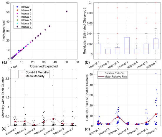 Figure 3 represents the accuracy of the spatial clusters identified. Panel (a) shows the observed-to-expected mortality counts plotted against the estimated relative risk for intervals 1–7, which shows high accuracies of the estimates; panel (b) provides box plots of the residuals, indicating low residuals; panel (c) illustrates the mortality data within each identified cluster, giving a localized perspective on the mortality distribution; and panel (d) displays the estimated relative risks associated with the spatial clusters for each interval, showing the changes in risk levels over time. The observed-to-expected mortality counts and the relative risks of significant spatial clusters are available in Supplementary Materials Table S1 and Table S2, respectively.