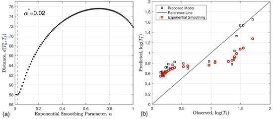 Optimal values and the accuracy of the predictions for interval 7. (a) Estimating the optimal value of based on the distance between the estimated and observed relative risk values. the optimal value occurs at (b) Log scale observed values versus those predicted using the proposed Markov chain model for interval 7. The proposed model predictions are superior to those of exponential smoothing (Mean Squared Error: 164.8 versus 258.7).