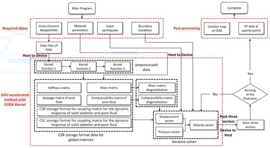 In the previous literature, the finite element calculation of the dynamic response of saturated fluid porous media was mostly addressed by implicit, semi-explicit, or explicit methods [24,25,26], which entailed issues such as low solution efficiency and low calculation accuracy. Based on a fully explicit time-domain integration method with second-order accuracy [27], this paper employs GPU acceleration technology to expedite calculation and solve the problem of traditional CPU programs. One of the challenges in parallel computing within finite element applications is to handle the thread conflict problem. In this paper, a novel approach is proposed to resolve the thread collision issue, namely the preprocessed non-assembly method (PNAM). The algorithm directly acquires the CSR storage format data of the global matrix from the element matrix and omits the intermediate process of generating the global matrix. This saves a considerable amount of GPU memory space, as the global matrix is a sparse matrix with numerous zero elements that are not necessary for the computation. Thus, it can be utilized to calculate the model with high mesh precision and further enhance the accuracy of the calculation results. In the iterative solution section, a new scheme is devised. It computes one formula at a time and is fast but demands a large GPU memory space. Nevertheless, due to the utilization of the CSR storage format for data storage, to a certain extent, the problem of the iterative solution requiring a large GPU memory space is mitigated. For a GPU with 4 GB of memory, it can be employed to compute the dynamic response problem of a two-dimensional saturated fluid porous media with a size close to 10 million elements (single precision). When transferring the resulting data from the GPU to the CPU, the data are encapsulated, which significantly reduces the data transfer time.