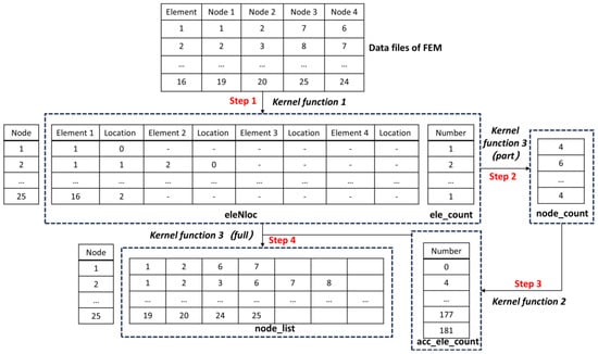 The preprocessed data are generated from the data file of FEM and obtained step by step through 3 kernel functions, as shown in Figure 3. The first step involves generating eleNloc and ele_count from kernel function 1. In the second step, eleNloc and ele_count are employed as arguments to generate node_count from kernel function 3 (part; refer to the first 10 lines of Algorithm 3). In the third step, acc_ele_count is produced from kernel function 2 with node_count as an argument. In the fourth step, eleNloc, ele_count, and acc_ele_count are utilized as arguments to generate node_list from kernel function 3 (full; refer to the all codes of Algorithm 3). The preprocessed data will be used to acquire the CSR and CSC storage format data for global matrices.
